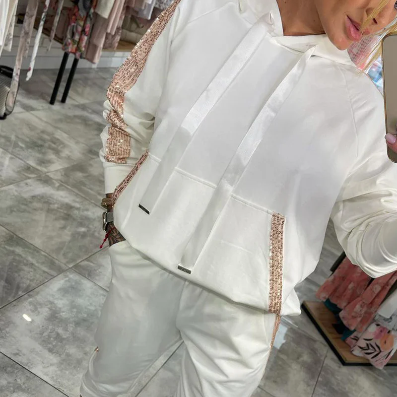 Lieferumfang: 1 * Damen-Set mit Kapuzenoberteil und -hose mit Kordelzug, 2-teilig