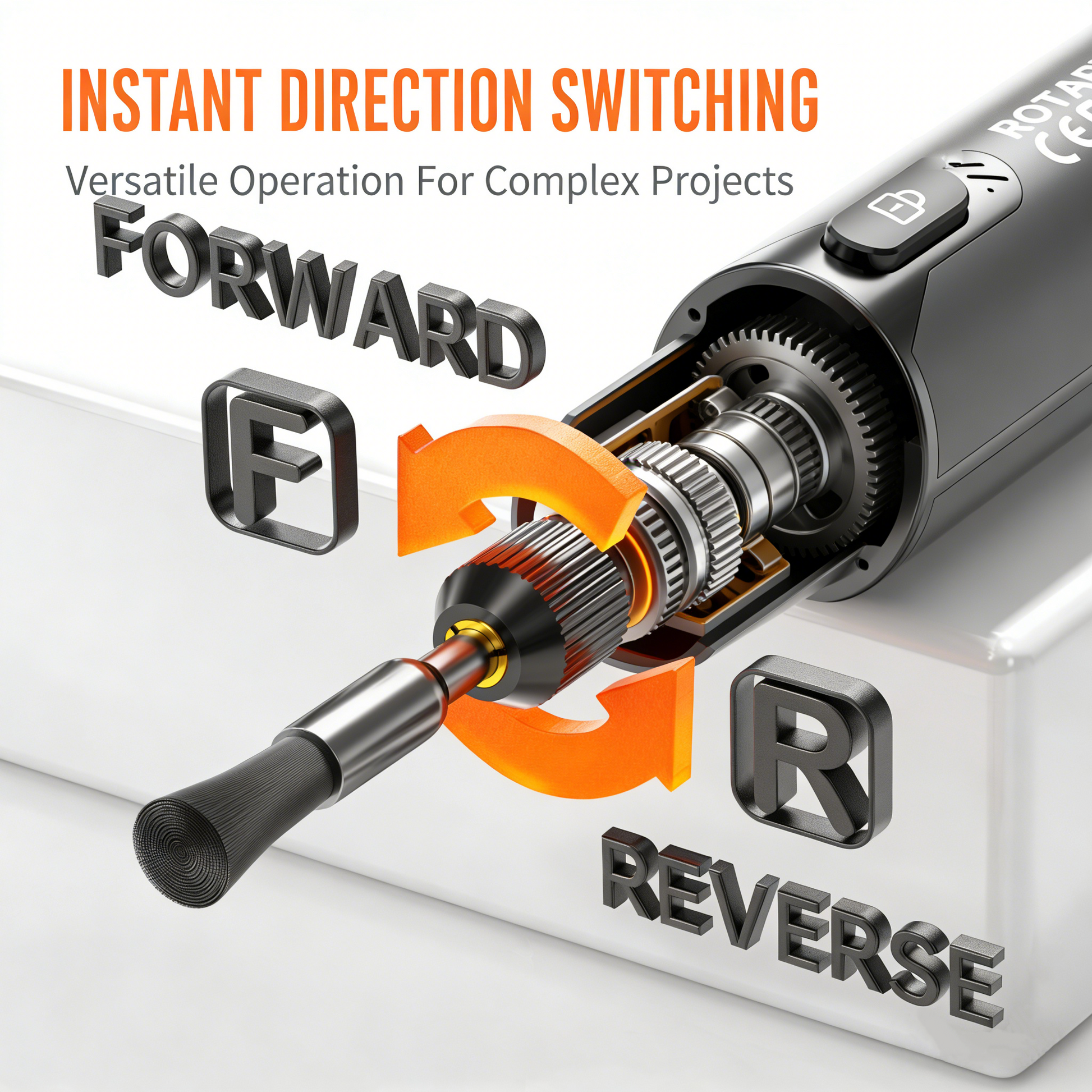 SOFORTIGER VORWÄRTS- UND RÜCKWÄRTS-SCHALTER – Wechseln Sie mit einem einfachen Knopfdruck nahtlos zwischen Vorwärts- und Rückwärtsdrehung. Diese vielseitige Funktion bietet mehr Kontrolle und Flexibilität und macht komplizierte Handwerks- und Polierarbeiten viel einfacher.