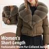 Modische, kurze Damenjacke mit warmem Pelzkragen (isländische weiße Entendaunen)